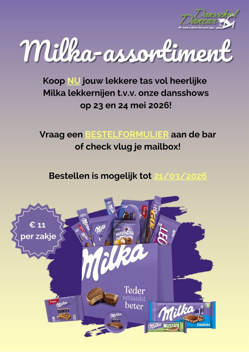 Milka-verkoop ten voordele van onze dansshows op 23 & 24 mei 2026.
